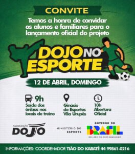 A Associação Dojo promove, no próximo domingo, 12 de abril, o lançamento oficial do projeto Dojo no Esporte, em Campo Mourão. O evento reúne alunos, familiares, equipe e comunidade em uma apresentação formal da iniciativa, no Ginásio de Esportes da Vila Urupês, com abertura às 10h. Executado pela Associação Dojo
