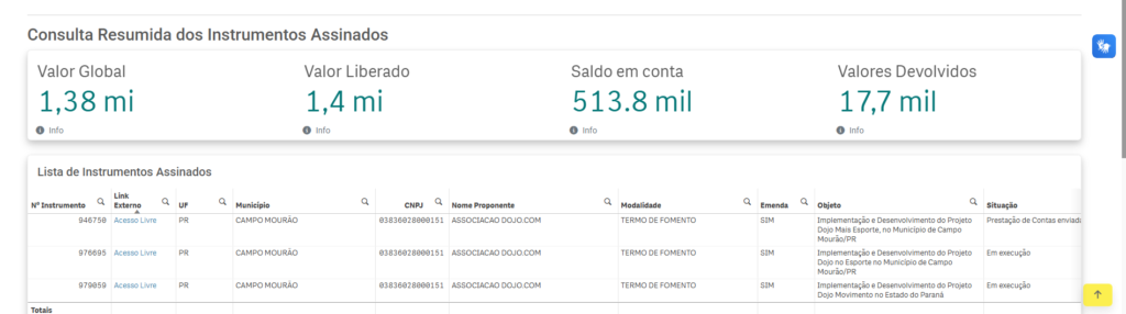 A Associação Dojo reafirma seu compromisso com a transparência, a responsabilidade na gestão dos recursos públicos e a correta aplicação dos valores recebidos por meio de parcerias firmadas com a administração pública. De acordo com os dados consolidados na consulta resumida dos instrumentos assinados, a Associação Dojo possui atualmente 3 instrumentos formalizados, voltados à execução […]